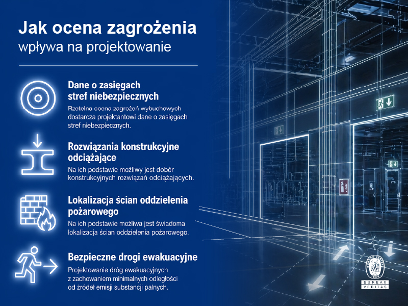 Rzetelna ocena zagrożeń wybuchowych dostarcza projektantowi precyzyjnych danych o zasięgach stref niebezpiecznych. Na ich podstawie możliwe jest świadome kształtowanie bryły obiektu: